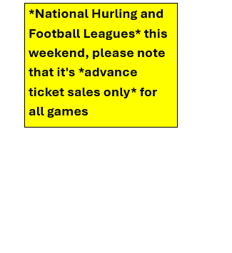 With the start of the *National Hurling and Football Leagues* this weekend, please note that it's *advance ticket sales only* for all games.